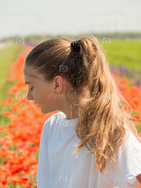 Девушка со светлыми волосами в хвосте и закрытыми глазами на фоне весеннего пейзажа с красными маками. Вид сбоку девочки-подростка крупным планом на поле с маками