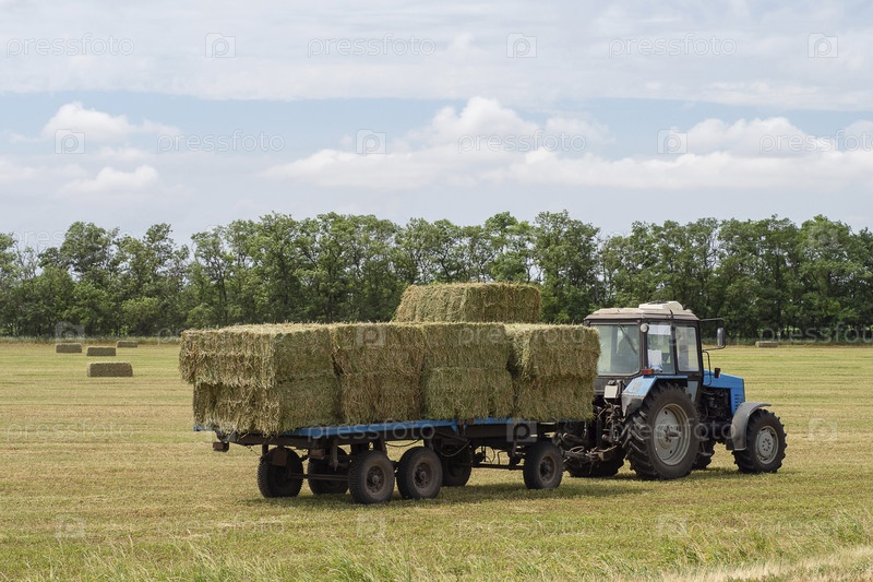 Перевозка тюков сена. Трактор везет тюки сена на прицепе через убранный сенокос. Трактор убирает тюки сена с поля после сбора урожая. Уборка Сбор кормов для животных