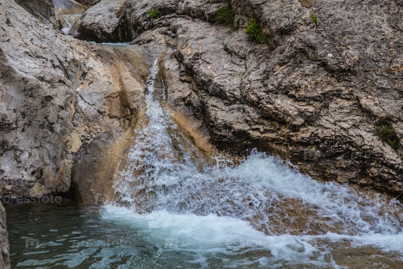 Поток воды между скалами горного ручья