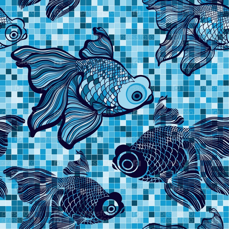 Бесшовный рисунок с мультяшной рыбой на мозаичном фоне