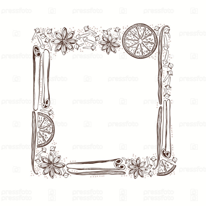 Векторная рамка со специями и дольками апельсина. Иллюстрация с местом для текста может быть использована для создания открытки, меню или пригласительного билета