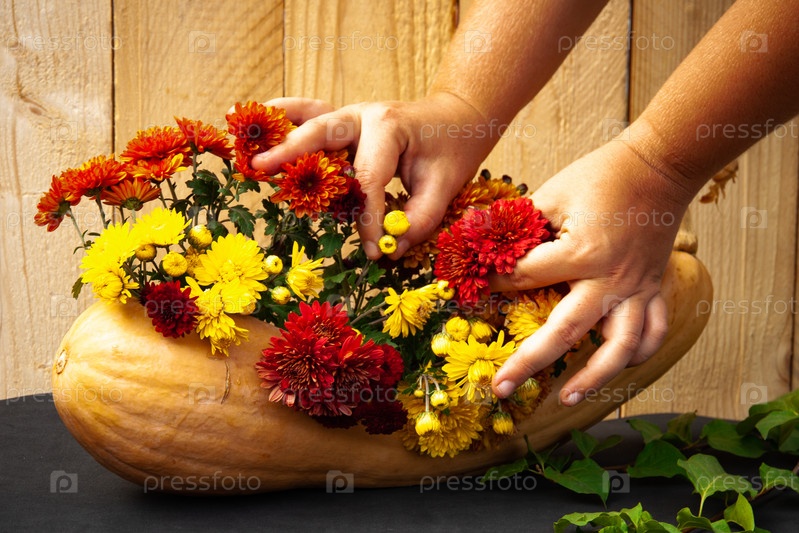Женская рука делает цветочную композицию из осенних садовых цветов и тыквы