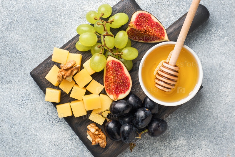 Кубики сыра, свежие фрукты, инжир, виноград, медовый орех на деревянной разделочной доске. Скопируйте пространство