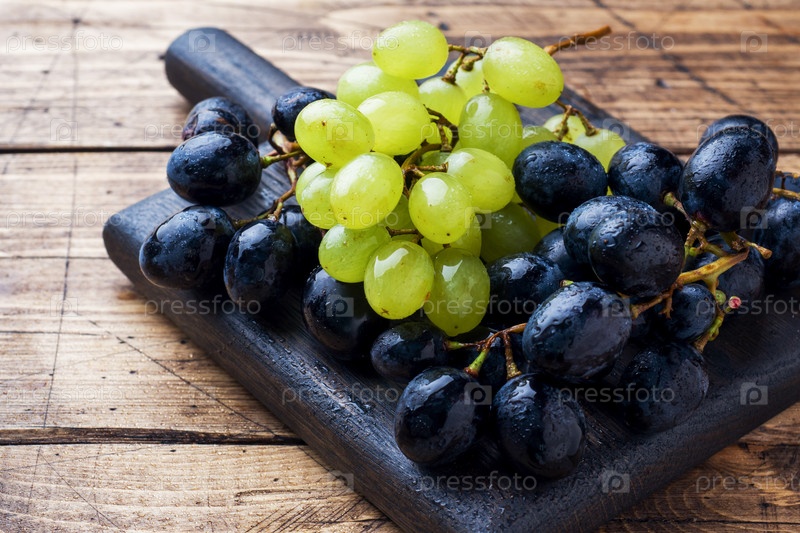 Грозди черного и зеленого винограда Киш Миш на деревянной доске. Скопируйте пространство