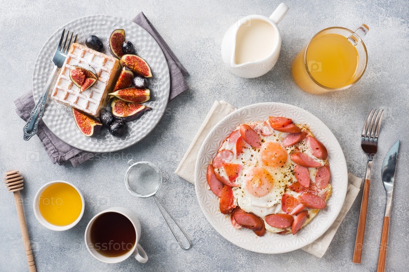 Блюда для домашнего приготовления сытного завтрака. Яичница с сосисками и помидорами. Бельгийские рифленые вафли с инжиром и виноградом. Серый бетонный фон