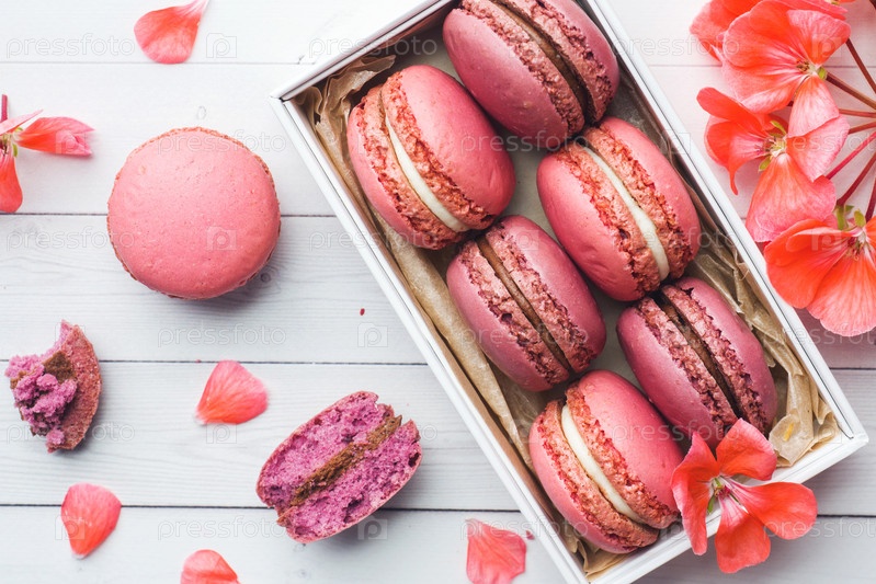 Розовый десерт макарон или миндальное печенье в коробке на белом фоне. Скопируйте пространство