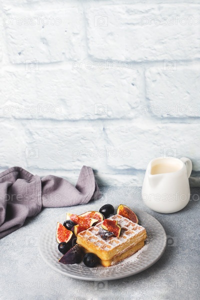 Традиционные бельгийские вафли с сахарной пудрой, виноградом и инжиром. Уютный домашний завтрак. Серый бетонный фон. Скопируйте пространство