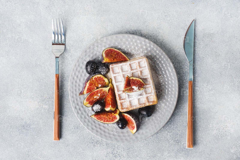 Традиционные бельгийские вафли с сахарной пудрой, виноградом и инжиром. Уютный домашний завтрак. Серый бетонный фон. Скопируйте пространство