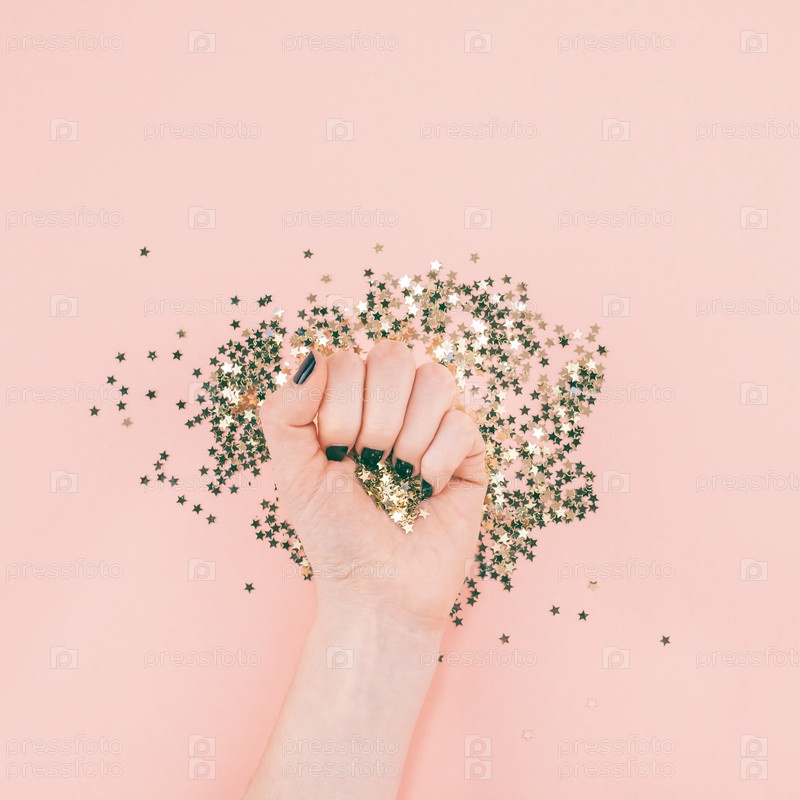 Женские руки покрыли конфетти золотыми звездами на розовом