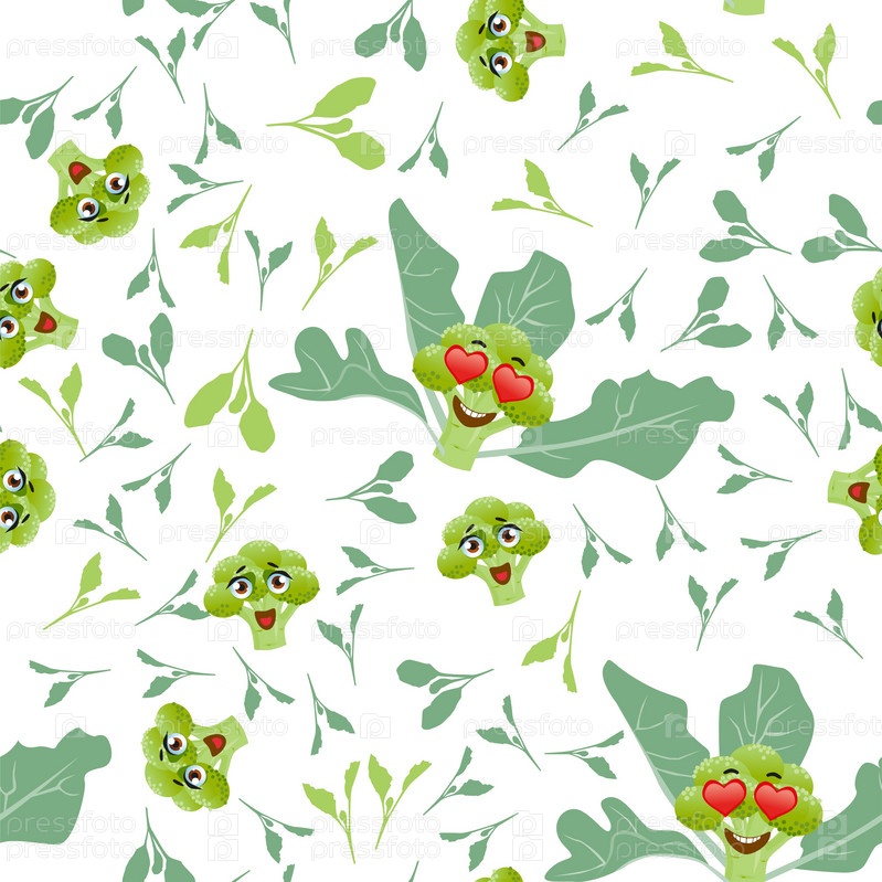 Бесшовный рисунок брокколи. Смешные милые лица персонажей