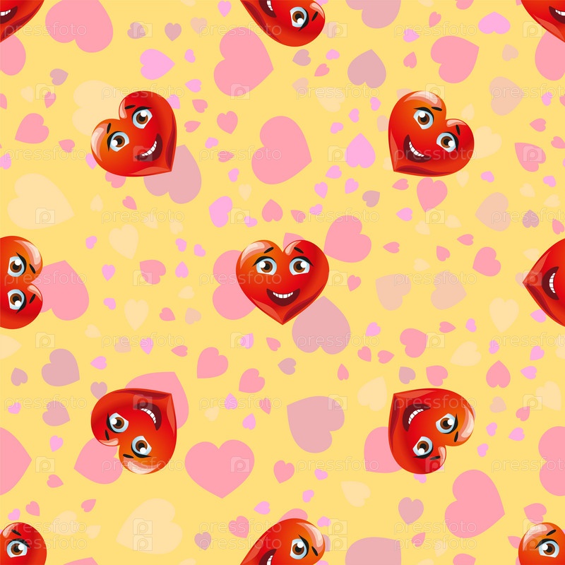 Бесшовный узор. Смешные милые лица персонажей красные сердца в День святого Валентина