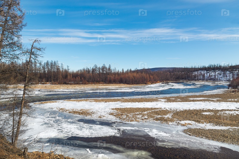 Вид на реку Чульман в Южной Якутии, Россия, середина октября. Осенний пейзаж