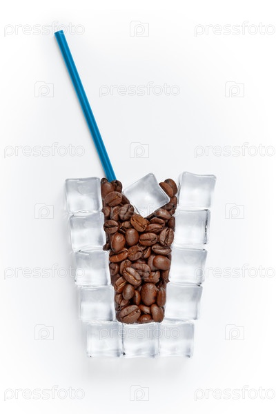 Стакан из кубиков льда, наполненный кофейными зернами. Концепция холодного кофейного напитка, ледяного коктейля