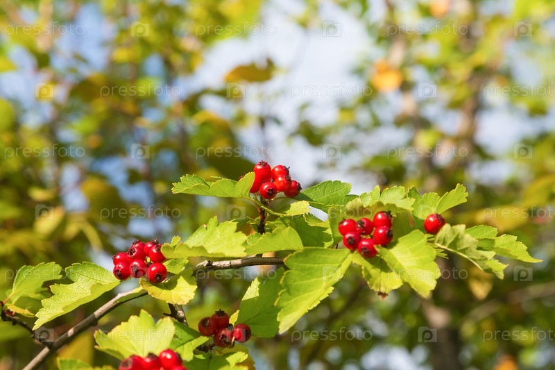 Ветка боярышника со спелыми красными ягодами на мягком фоне листвы