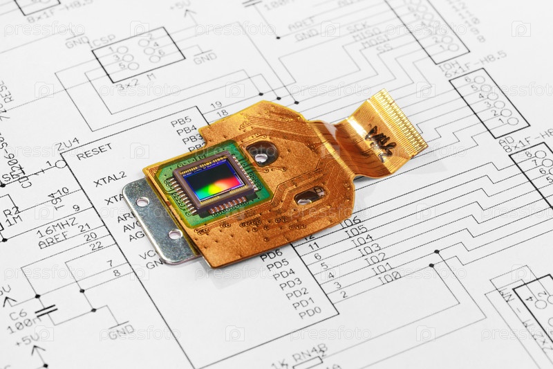Датчик CMOS на гибкой печатной плате на фоне принципиальной электрической схемы