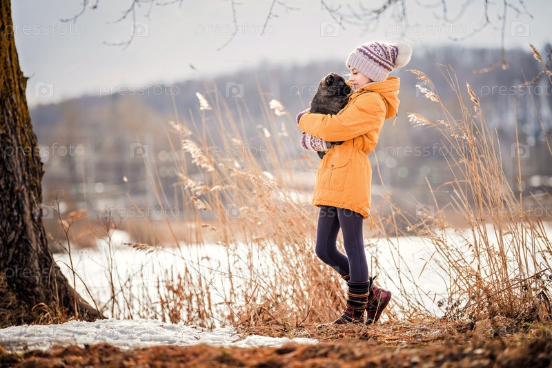 Девушка в желтой куртке и теплой вязаной шапке гуляет по берегу заснеженного озера и прижимает к себе маленького щенка