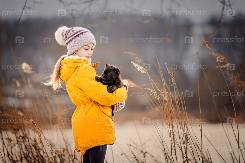 Девушка в желтой куртке и теплой вязаной шапке гуляет по берегу заснеженного озера и прижимает к себе маленького щенка