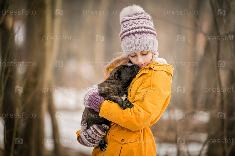 Маленькая девочка в платье гуляет по мрачному зимнему парку и прижимает к себе крошечного щенка
