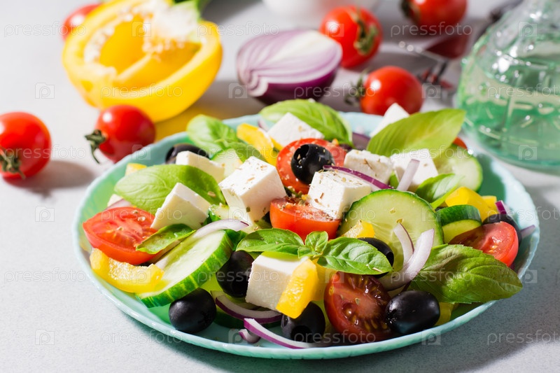 Свежий домашний греческий салат с листьями базилика на тарелке и ингредиентами для приготовления пищи на столе. Домашняя жизнь. Жесткий свет