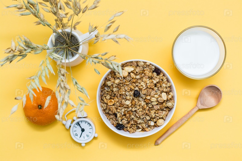 Здоровый сытный завтрак. Запеченная мюсли в миске, стакан молока, апельсин, деревянная ложка и будильник на желтом фоне. Вид сверху