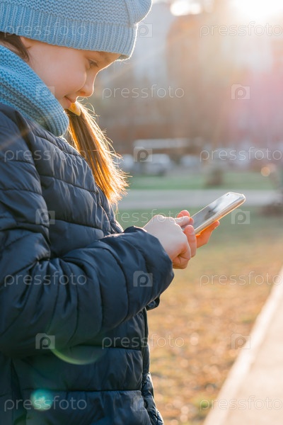 Девушка в куртке держит смартфон и пишет сообщение в лучах вечернего солнца. интернет серфинг