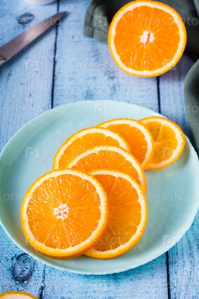 Свежий сочный нарезанный апельсин на тарелке на столе. Здоровая пища. Вертикальный вид