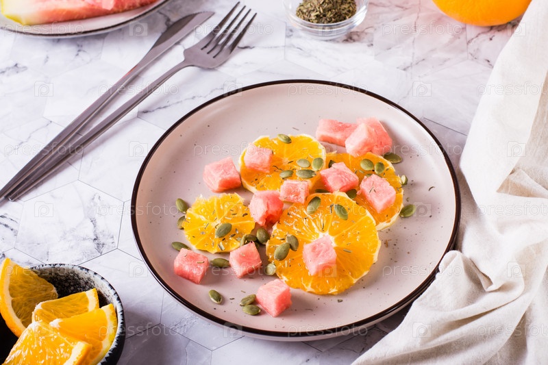 Свежий салат из апельсина, арбуза и тыквенных семечек на тарелке на столе. Органическая диета