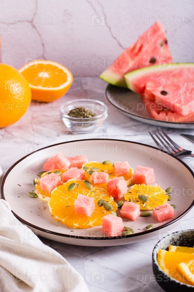 Фруктовый салат из арбузных, апельсиновых и тыквенных семечек на тарелке на столе. Здоровая пища. Вертикальный