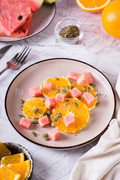 Свежий салат из апельсина, арбуза и тыквенных семечек на тарелке на столе. Органическая диета. Вертикальный