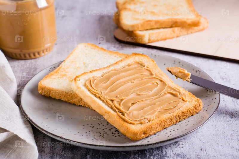 Сэндвич с арахисовым маслом на поджаренном хлебе на тарелке и банка масла на столе
