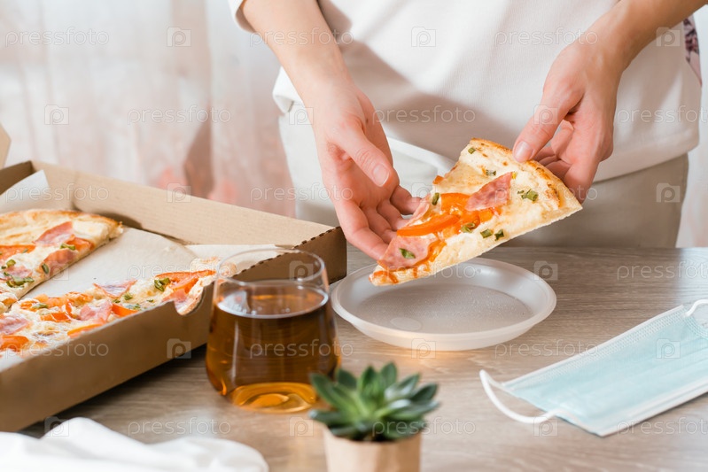 Еда на вынос. Женщина кладет кусок пиццы в одноразовую пластиковую тарелку и коробку с пиццей на стол на кухне