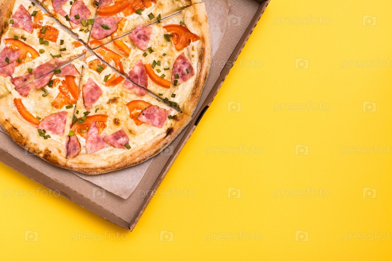 Самовывоз и доставка. Готовая к употреблению пицца в картонной коробке на желтом фоне