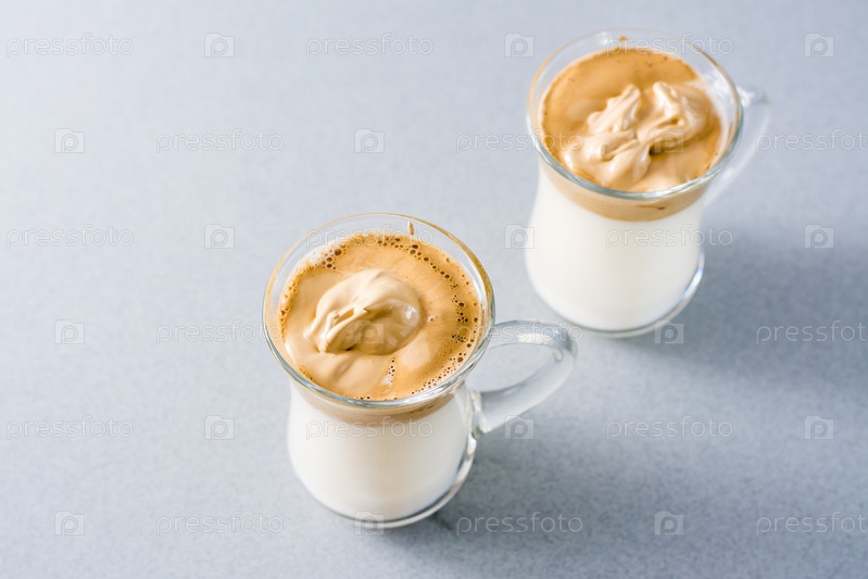 Карантинная модная кухня. Две чашки с кофе далгона на сером фоне