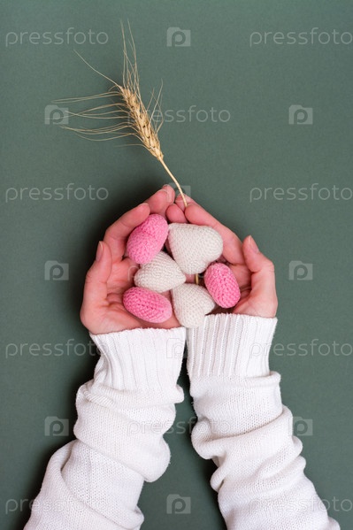 Натюрморт на День святого Валентина. Вязаные сердца в женских руках и колос пшеницы на зеленом фоне. Вертикальный вид