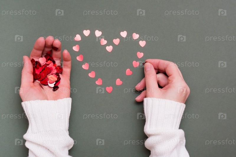 Женские руки выкладывают из маленьких сердечек форму сердца на зеленом фоне