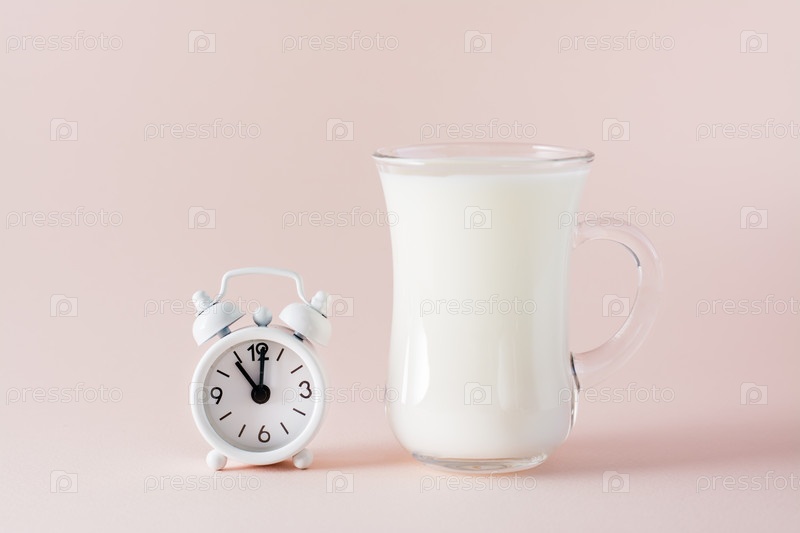 Хороший сон. Стакан молочного продукта для хорошего засыпания и будильник на розовом фоне