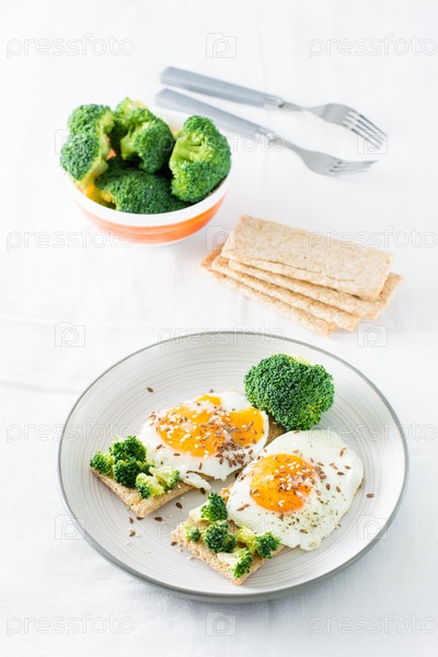 Брускетта с яичницей и брокколи на зерновых хлебцах с кунжутом и льняным семенем на тарелке на столе. Вертикальный вид