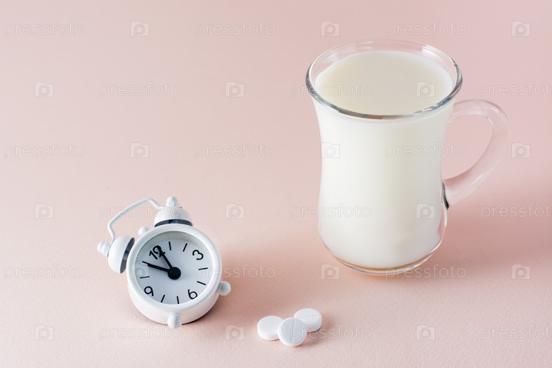 Хороший сон. Стакан молока продукт для хорошего засыпания, снотворное и будильник на розовом фоне. Вечерний ритуал