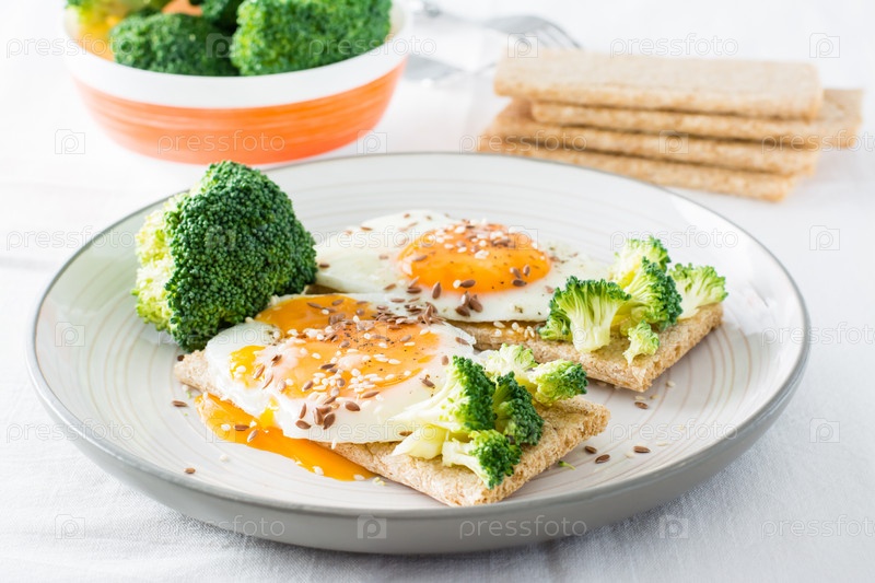 Брускетта с яичницей и брокколи на зерновых хлебцах с кунжутом и льняным семенем на тарелке и миска брокколи на столе