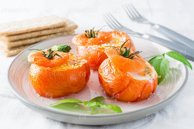 Запеченные помидоры с яйцом и листьями базилика на столе. Диетический обед. Крупный план