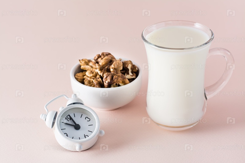 Хороший сон. Продукты для хорошего сна - молоко, грецкие орехи и будильник на розовом фоне