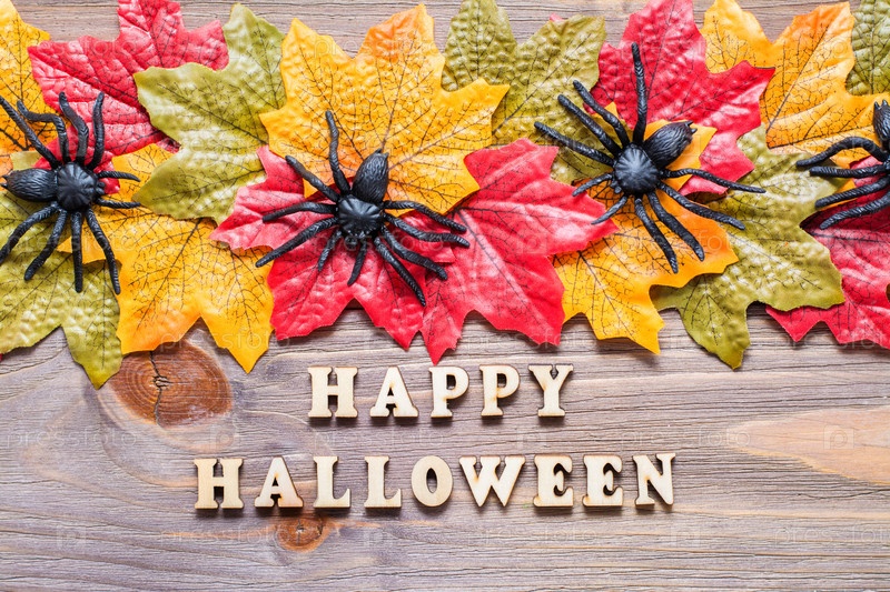 Хэллоуин счастливый. Фраза в окружении кленовых листьев и пауков на деревянном фоне