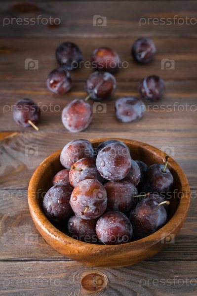 Спелая голубая слива в деревянной тарелке на столе. Осенний урожай. Деревенский стиль. Здоровое питание