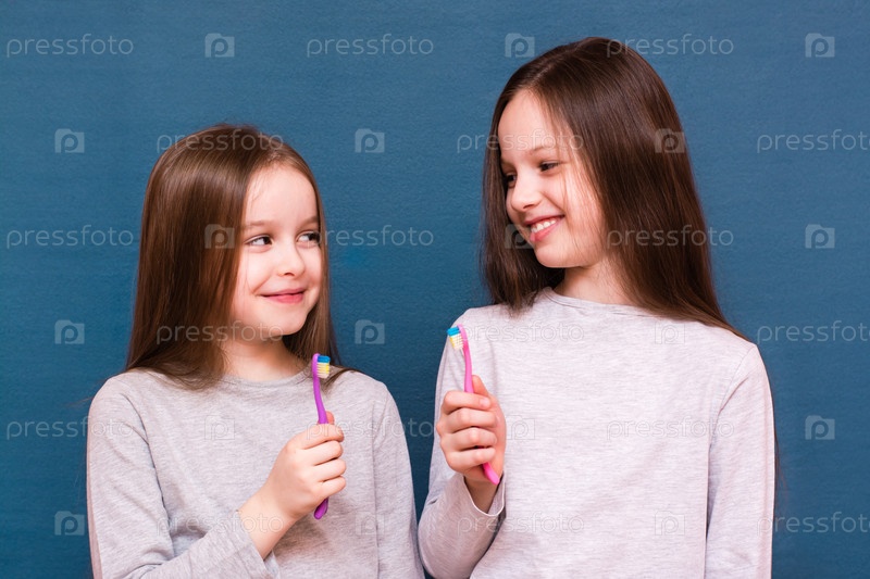 Две девушки улыбаются, смотрят друг на друга и держат в руках зубные щетки на синем фоне. Понятие о гигиене полости рта у детей