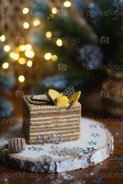 Кусок классического медового торта на деревянной подставке с красивым рождественским боке на заднем плане. Вкусный рецепт. Концепция праздника
