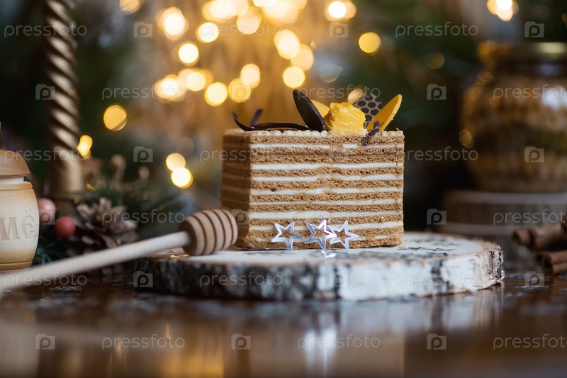 Кусок классического медового торта на деревянной подставке с красивым рождественским боке на заднем плане. Вкусный рецепт. Концепция праздника
