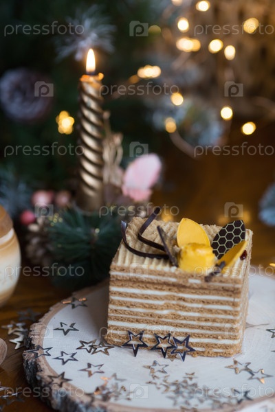 Кусок классического медового торта на деревянной подставке с красивым рождественским боке на заднем плане. Вкусный рецепт. Концепция праздника