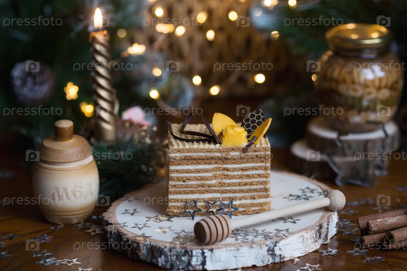 Кусок классического медового торта на деревянной подставке с красивым рождественским боке на заднем плане. Вкусный рецепт. Концепция праздника