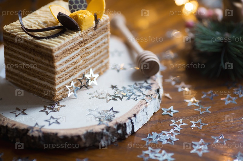 Кусок классического медового торта на деревянной подставке с красивым рождественским боке на заднем плане. Вкусный рецепт. Концепция праздника