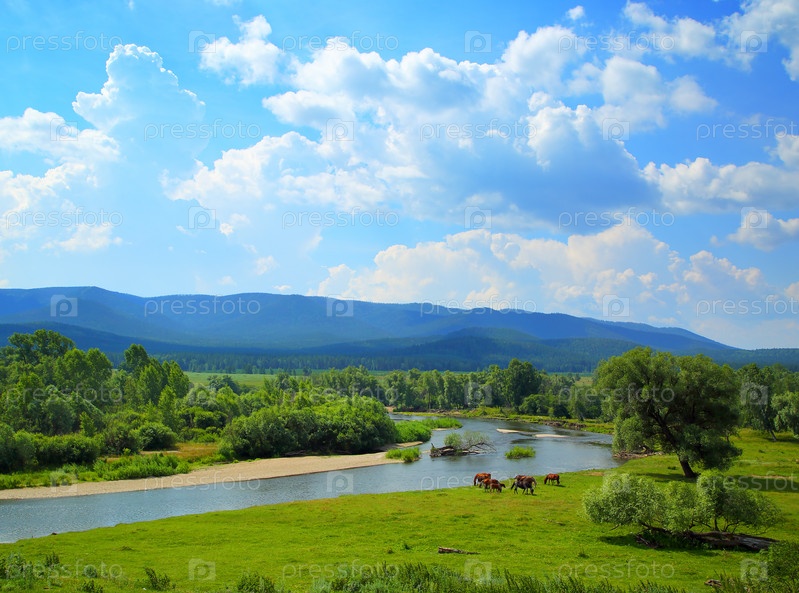 Летний пейзаж с речными горами и лошадьми